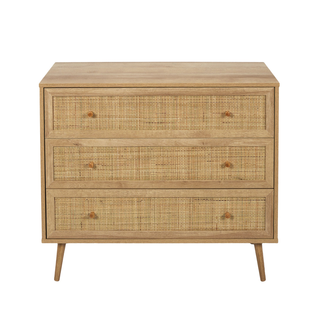 Bring a natural and warm touch to your interior with the Bali chest of drawers. Its design subtly combines light wood with woven rattan fronts, creating a look that’s both authentic and stylish. Perfect for a bedroom or living room, it offers practical and elegant storage.