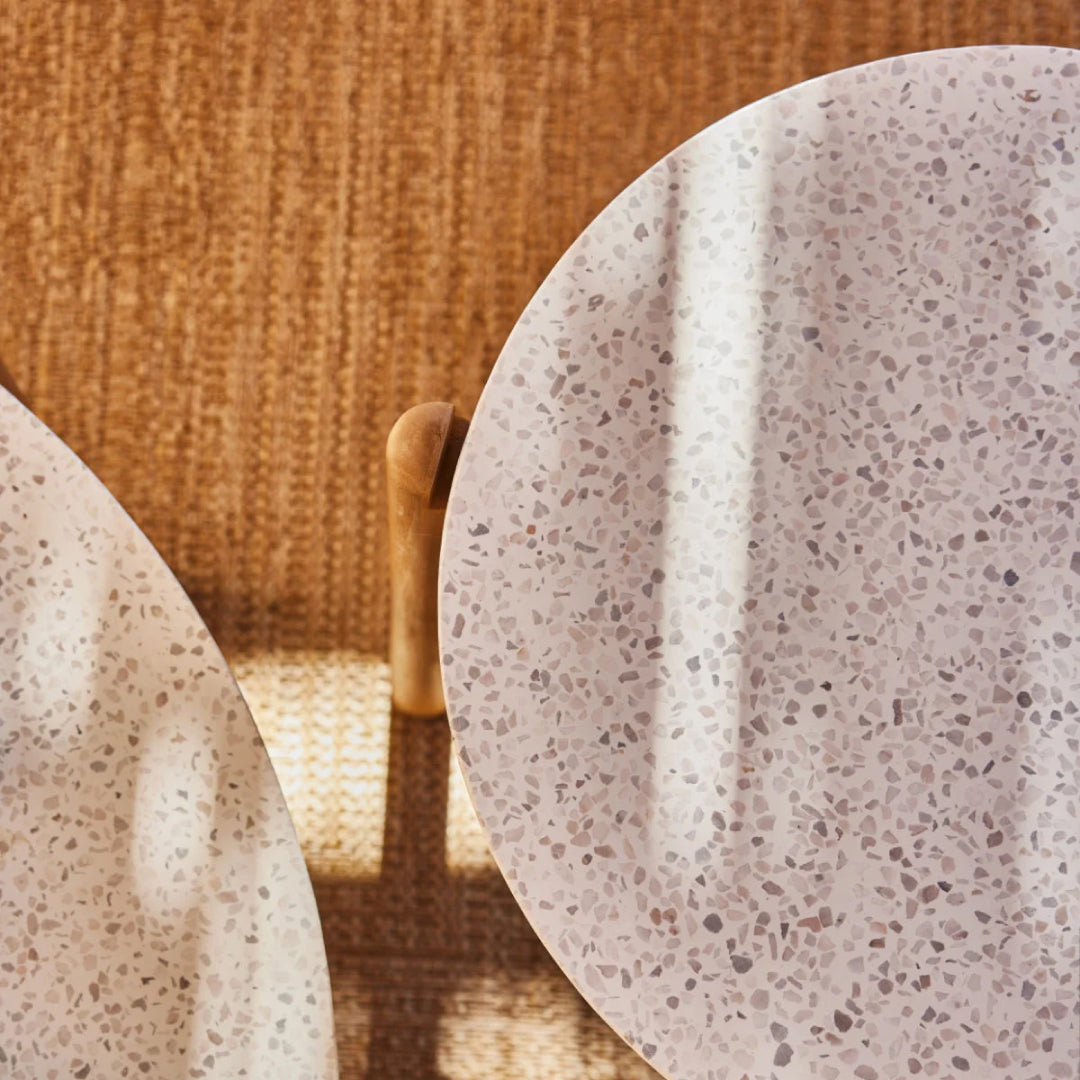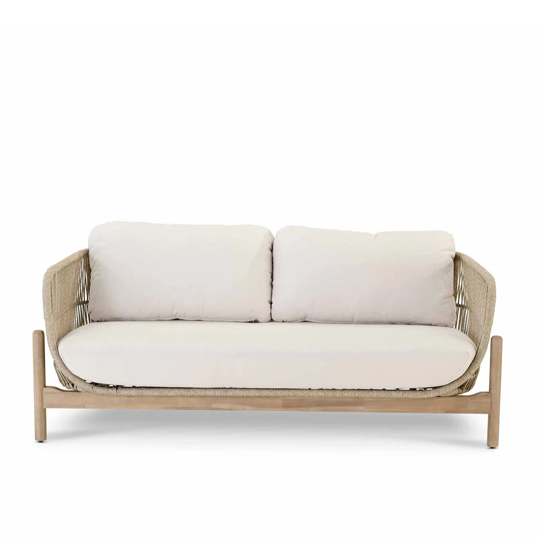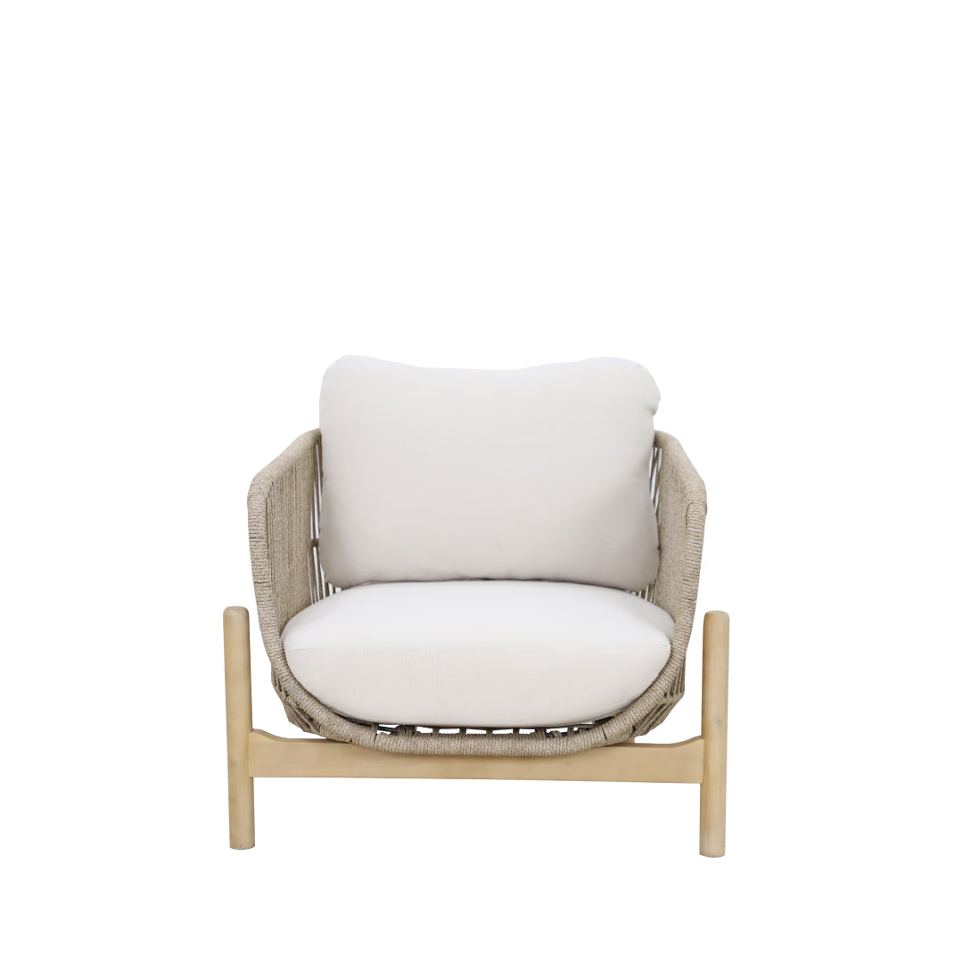 Extend the relaxing vibe of your home with the comfortable Rimini 5-Piece Outdoor Lounge Setting. With durable acacia timber construction, this lounge setting gives you the vibes for a peaceful and relaxing mood, while the light wood stain, rope detailing and cream colored cushioning combine to make a warm and welcoming ensemble.